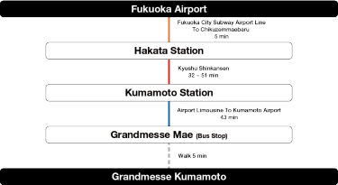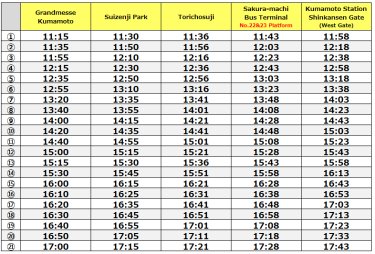 For Exhibitors: Please note that this shuttle bus service will only operate during the show period (May 28nd - 30th). If you need transportation to the venue during the setup period (setup days: May 26th & 27st), please use public transportation buses heading to Grandmesse Kumamoto. Reference: